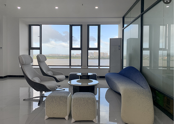辦公場地從原先的 400 多平擴(kuò)大至 800 多平,新址位于海南省??谑忻捞m區(qū)濱江路 80 號灃辰外灘 B 座 12 樓,抵達(dá) 12 樓,自動(dòng)門打開首先映入眼簾的就是明亮大氣的登尼特前臺(tái)。